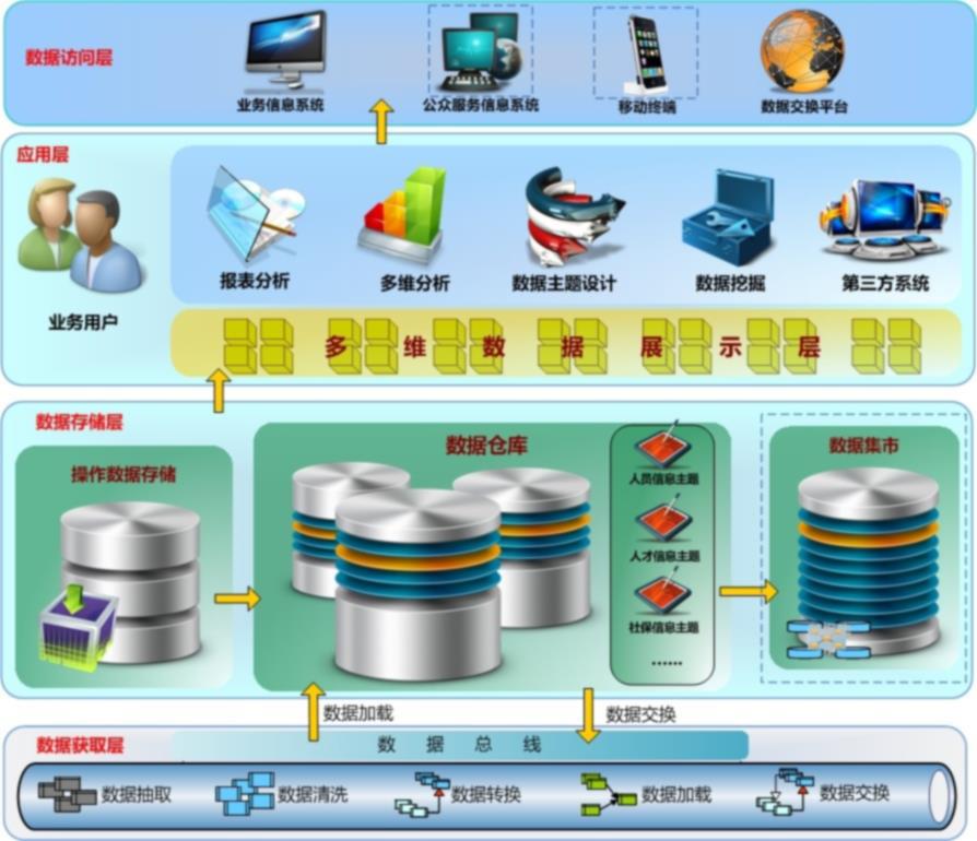 主要包括:数据总线管理;数据入库管理;数据可靠性分析;数据清洗;数据安全管理;数据元管理;数据供给平台;数据主题和模型分析;OLAP分析;数据挖掘模型管理;数据维度分析和模型管理;政策法规库(维护)管理和分析;数据查询分析平台(可自定义和多维度分析)等主要部分。